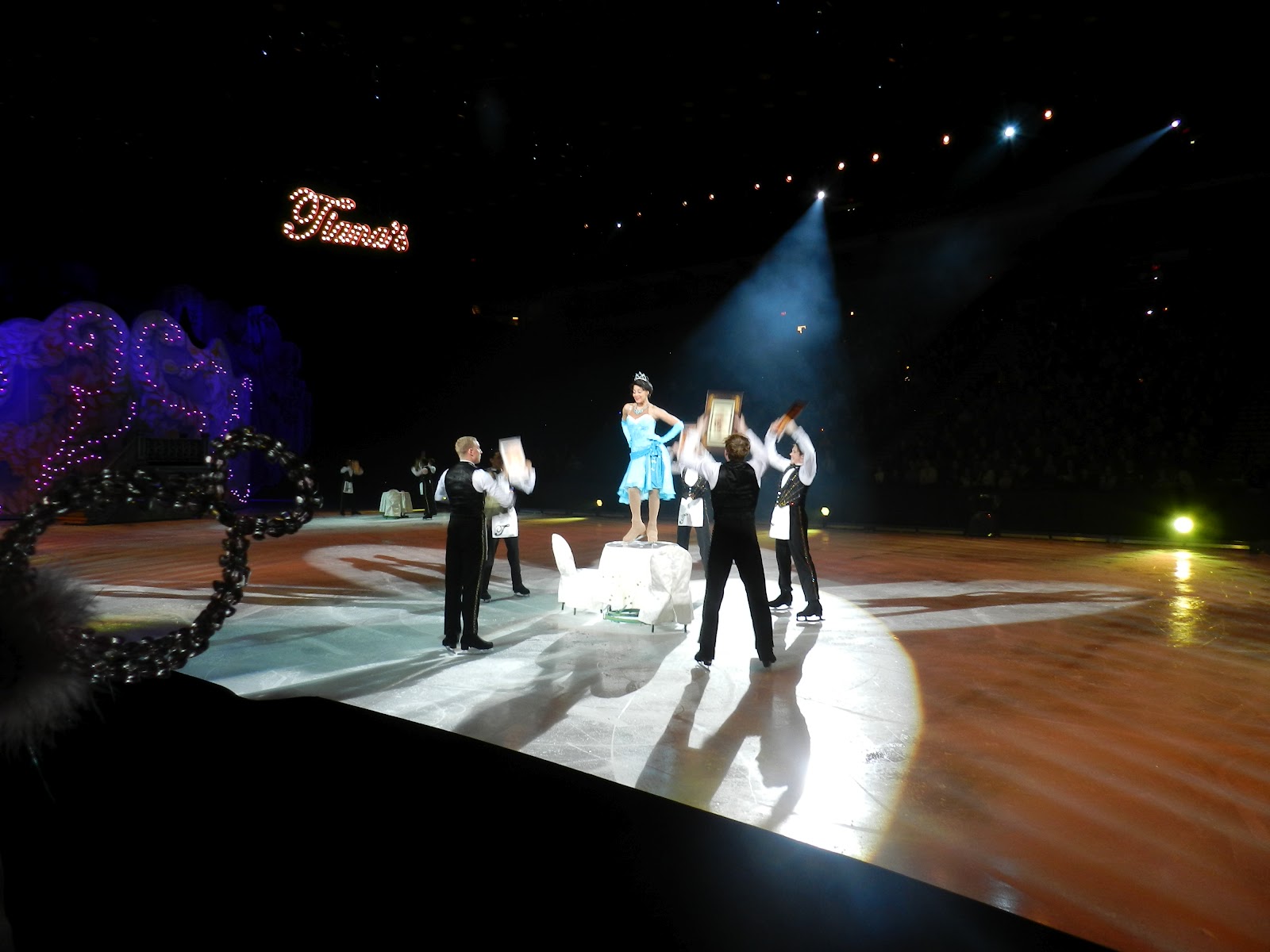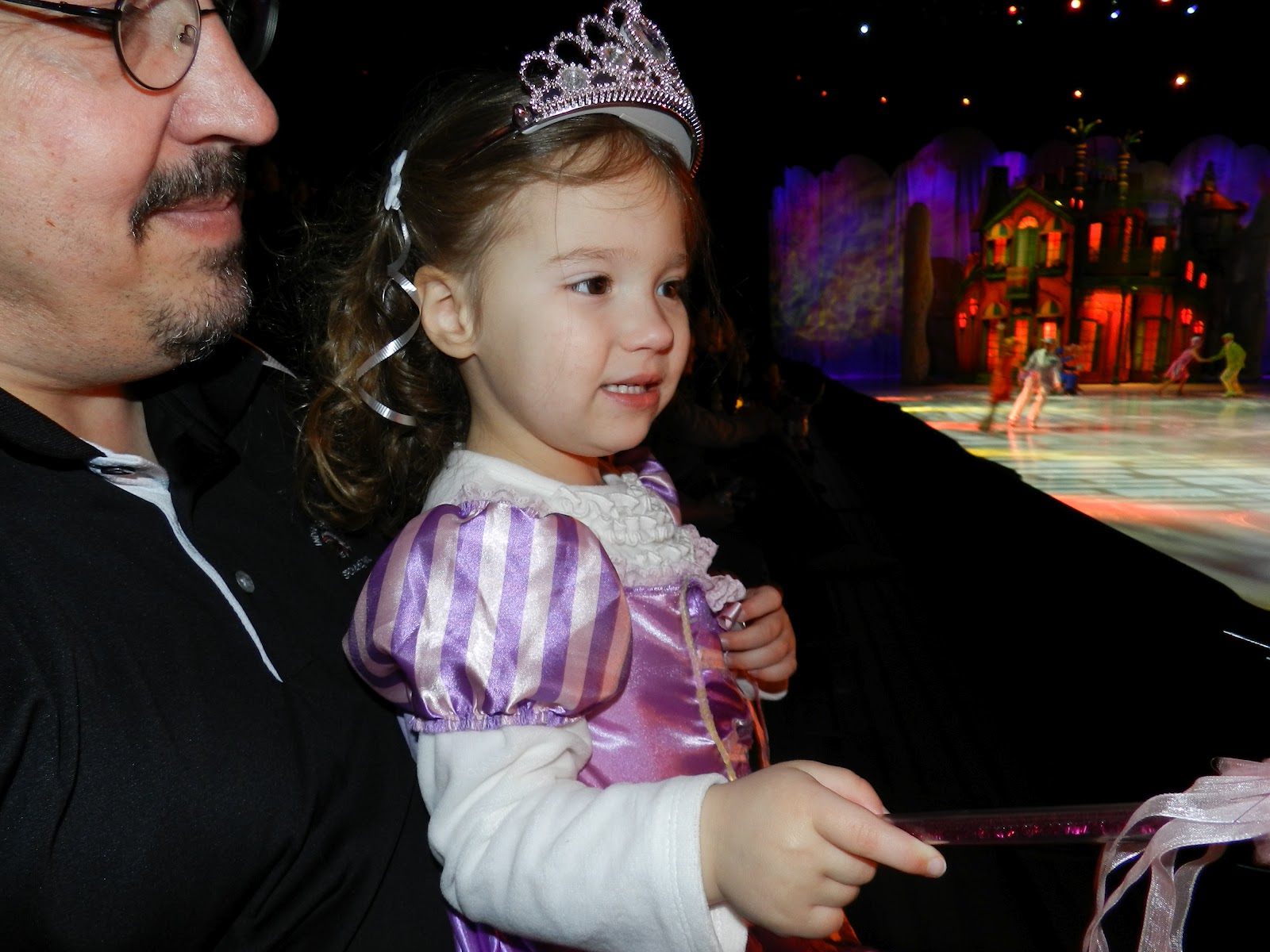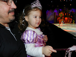We all had a fun family date night. Robert got us all tickets to go see Disney on Ice. Megan got dressed up in her princess dress and she was so excited, even though she had no idea what to expect. Robert and I were both so excited to see Megan's face when the show started. We had excellent seats, right up by the ice. Megan, of course, scored a new fancy crown and wand to have during the show. The show was about the stories of Tianna (Princess and the Frog), Repunzel, and Cinderella. Megan is obsessed with Cinderella and Repunzel right now. Megan was, as always, a perfect angel throughout the show even though it got late in the evening, way past her bedtime. However, she did start to cry when the show was over, because she really thought that she would get to go skate on the ice with the princesses.